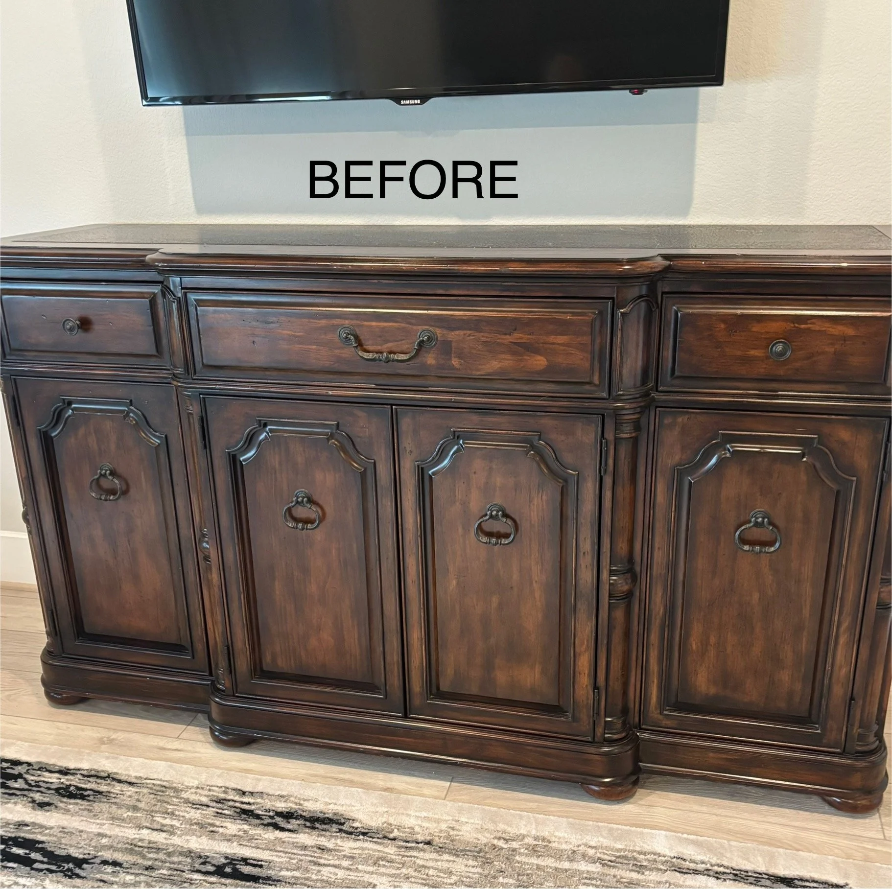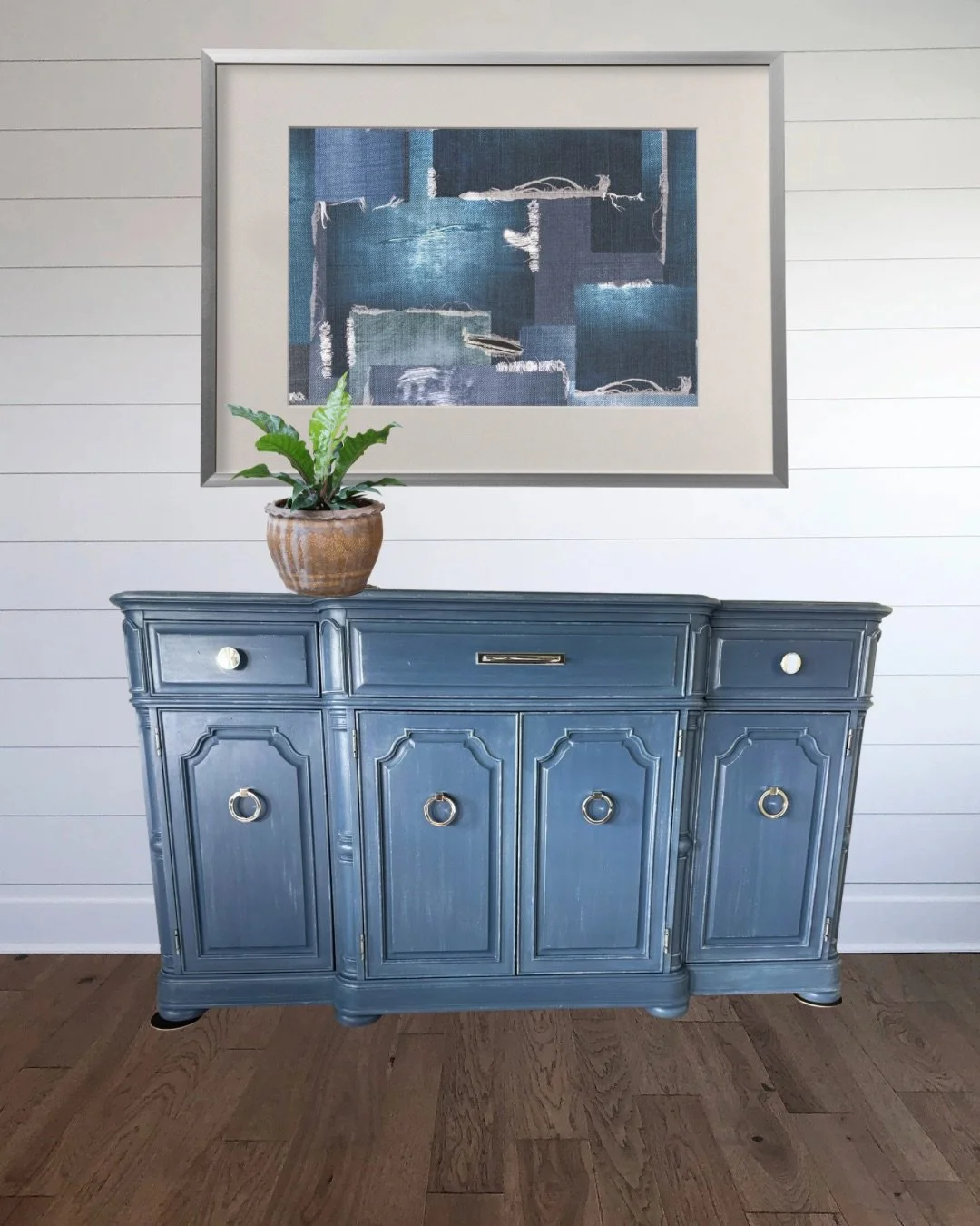 This buffet serves as a media console in my client’s bedroom. The original dark finish didn’t work with her decor, so she decided she wanted to paint it blue. With some white dry brushing, now it looks like aged denim!